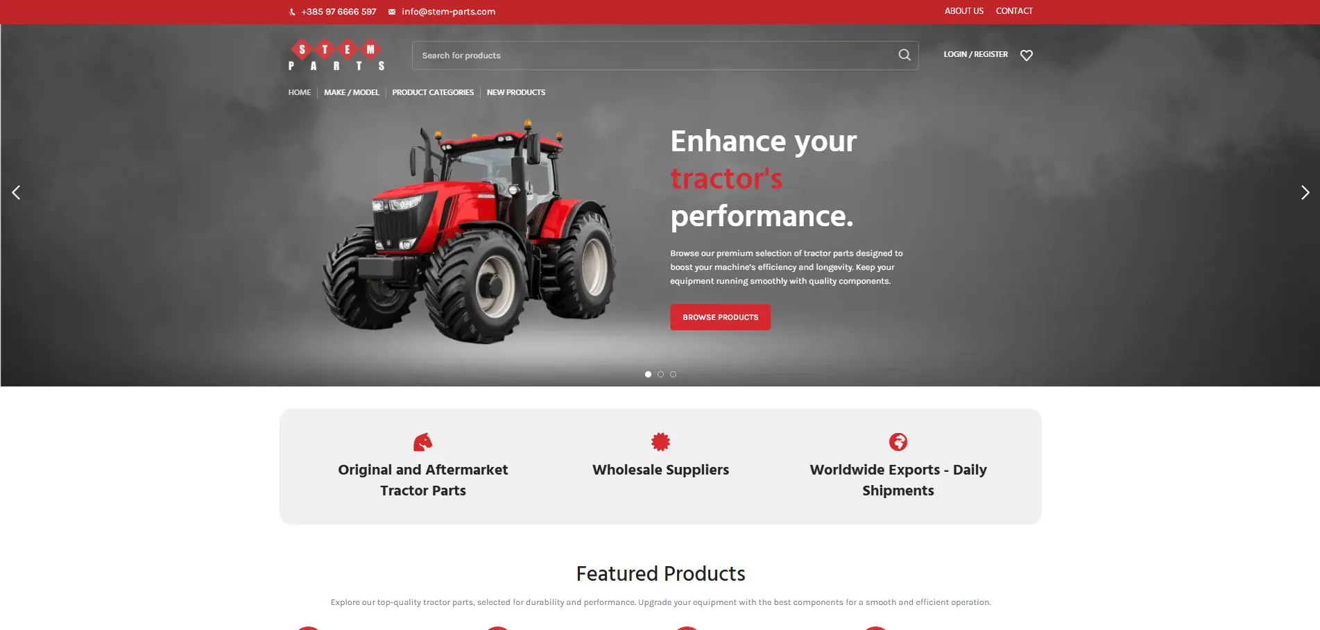 Stem Parts Europe is a specialized B2B eCommerce platform designed to streamline the wholesale distribution of high-quality tractor parts and agricultural equipment across Europe. The goal of the project is to create a robust, user-friendly online store tailored to the needs of agricultural businesses, repair shops, and equipment resellers.